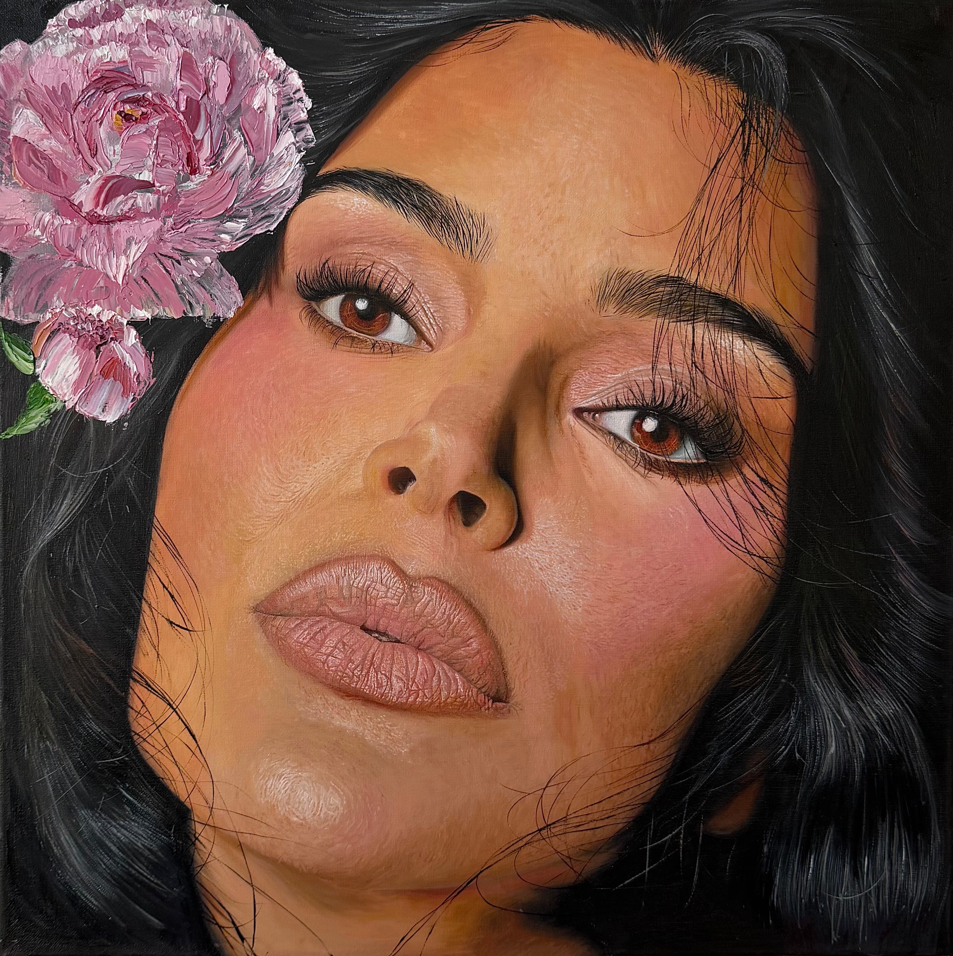 Dieses Werk (120X80 CM) verbindet hyperrealistische Porträtmalerei mit expressiver Abstraktion. Die leuchtenden Grüntöne der Augen und die intensiven Rosé- und Goldakzente schaffen eine sinnliche Spannung zwischen Realität und Traum. Zarte Blütenformen verschmelzen mit dem Gesicht und symbolisieren die fragile Schönheit und gleichzeitige Stärke der Weiblichkeit. Goldene Strukturen verleihen dem Bild eine erhabene, fast sakrale Dimension und heben die Einzigartigkeit des Augenblicks hervor.