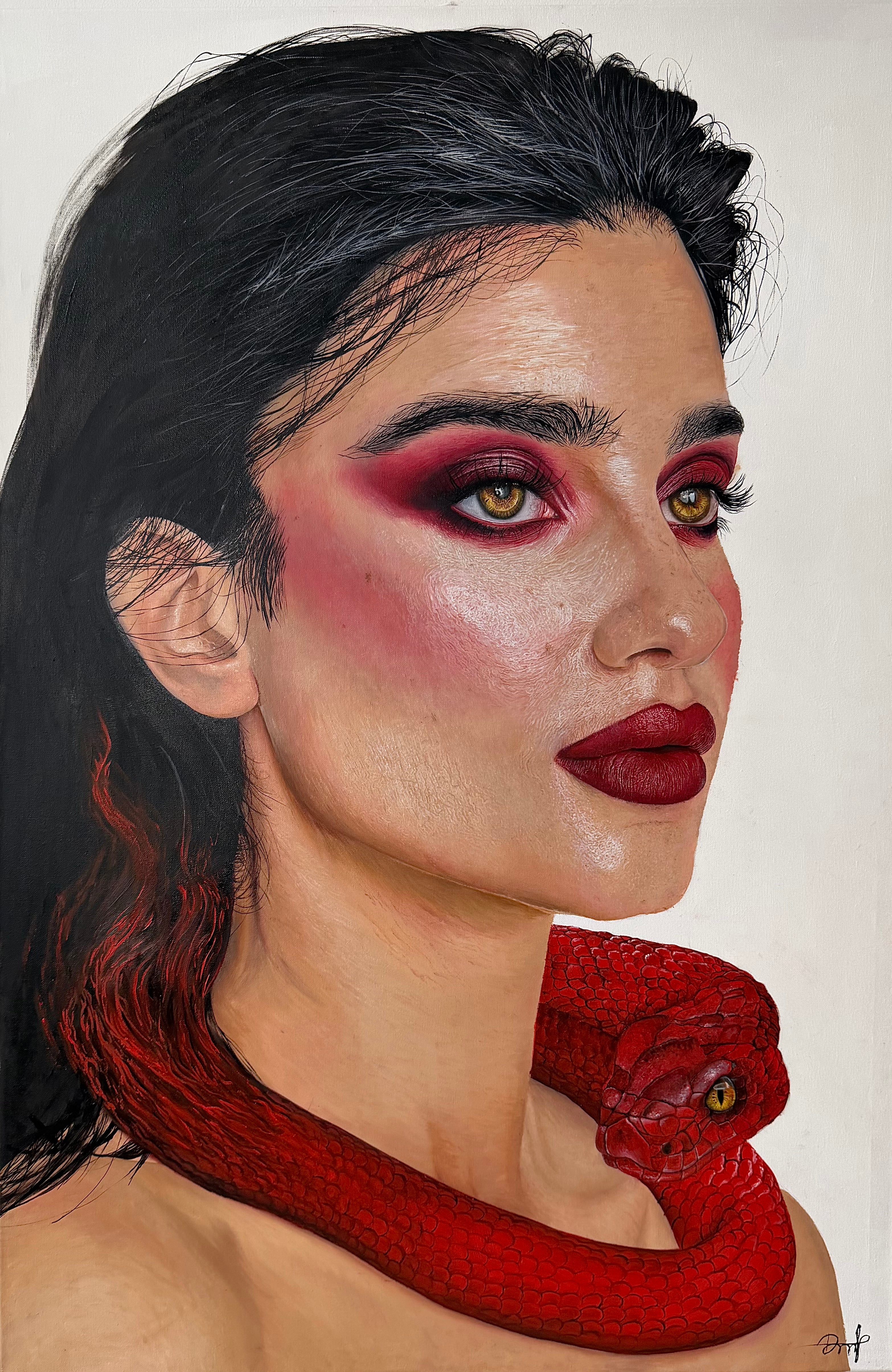 Das Gemälde (40X40CM) zeigt ein ausdrucksstarkes Porträt einer Frau, deren glänzende Haut, volle Lippen und intensiver Blick im Zentrum stehen. Umgeben von kräftigen, fließenden Farben, roten Lilien und einem Apfel entfaltet sich eine bildgewaltige Symbolik zwischen Verführung, Natur und Stärke. Dynamische Pinselstriche, kontrastreiche Details und die Mischung aus Realismus und expressiver Malerei verleihen dem Werk eine einzigartige Intensität.